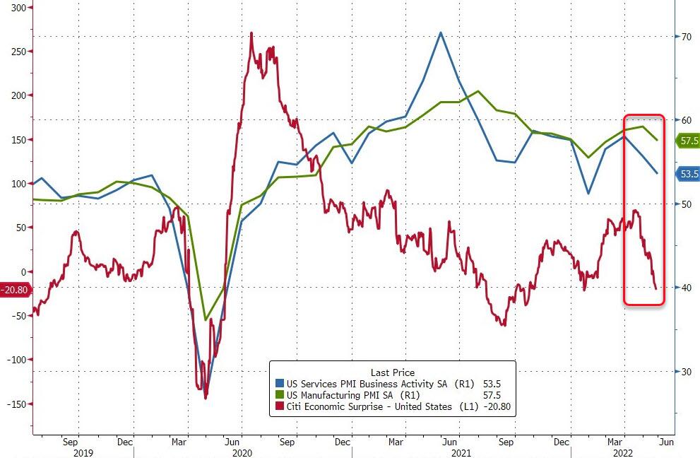 Wskaźnik PMI w sektorze usług w USA spadł do najniższego poziomu od czterech miesięcy, natomiast wskaźnik PMI w sektorze produkcji osiągnął najwolniejszy od trzech miesięcy wzrost aktywności fabryk. Źródło: Bloomberg via ZeroHedge