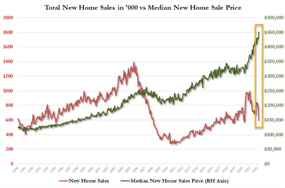 Sprzedaż nowych domów spadła do najniższego poziomu od kwietnia 2020 r., podczas gdy mediana cen skoczyła o 19,6% r/r (450,6 tys. USD), a średnia o 31,2% r/r (570,3 tys. USD). Źródło: ZeroHedge