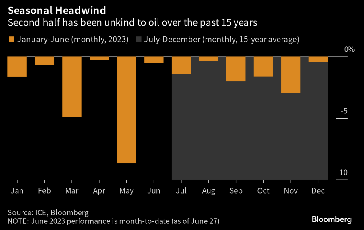 Co w drugiej połowie roku? Sezonowośc na ropie wskazuje na to, że nie powinno być zbyt dobrze, choć jednocześnie trzeba pamiętać o tym, że Arabia Saudyjska zetnie 1 mln brk na dzień dodatkowo w lipcu, a popyt w krajach arabskich jest podwyższony. Można wobec tego oczekiwać, że lipiec będzie całkiem niezły, biorąc również pod uwagę to, że ropa ostatecznie w tym miesiącu najprawdopodobniej zaliczy niewielki wzrost.