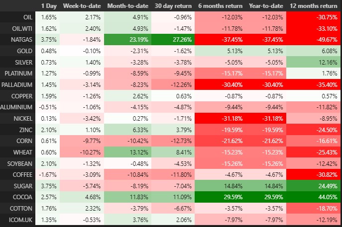 Patrząc na zmiany cen surowców w pierwszej połowie roku zauważymy, że większość z nich straciła na wartości. Wyjatkiem jest część surowców "miękkich", a konkretnie cukier oraz kakao ze względu na niepewność dotyczącą podaży. Zyskało również złoto w oczekiwaniu na koniec podwyżek w USA oraz na całym świecie, choć ostatnio dosyć wyraźnie udało się zneutralizować te wzrosty, biorąc pod uwagę dwa z rzędu miesięczne spadki.