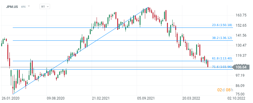Wykres akcji JPMorgan (JPM.US), interwał W1. Akcje poruszają się w dynamicznym trendzie spadkowym od jesieni 2021 roku, który zbiega się z aktywnością tzw. insiderów, którzy na przestrzeni ostatnich 12 miesięcy sprzedali blisko 1,2 mln USD akcji spółki wobec niespełna 26 000 kupionych. Statystyka wskazuje też na intensywną sprzedaż insiderów na poziomach powyżej 150 USD i malejącą sprzedaż w ciągu ostatnich 3 miesięcy (wciąż jednak przewyższającą kupno). Cena akcji podążą w kierunku covidowych wycen z jesieni 2020 roku co obrazuje fatalny sentyment wokół walorów banków. Słabe otwarcie może zwiastować próbę ataku podaży na poziomy przy 103 USD, gdzie znajduje się 71.6 zniesienie wg. Fibonacciego, broniące psychologicznej bariery 100 USD za akcję. Spadek poniżej tych poziomów może zwiastować dłuższe osłabienie i potencjalnie zwiastować zbliżający się, stopniowy wzrost zainteresowania byków szukających okazji. Źródło: xStation5