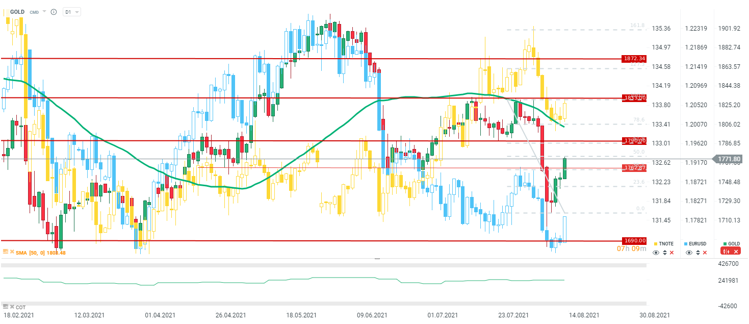 Najbardziej spektakularne wydaje się odbicie złota w tym tygodniu. Jak widać byki na tym rynku nie dają za wygraną. Źródło: xStation5