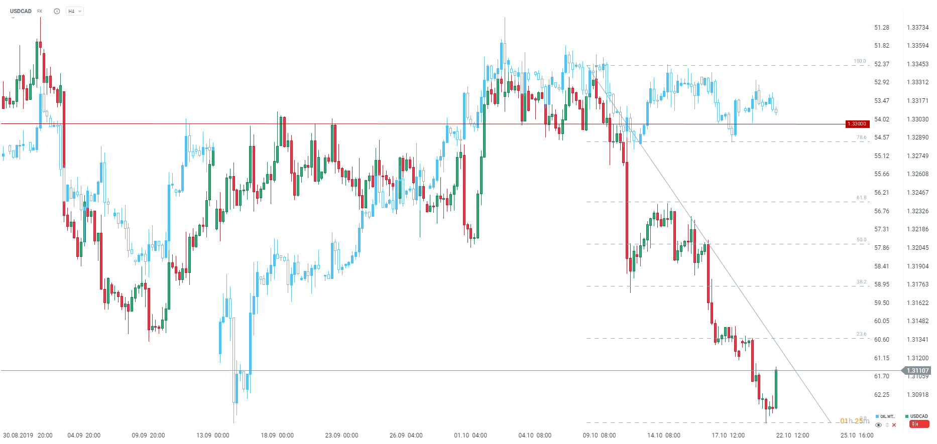Para USDCAD odbija po odczycie, ale warto zauważyć, że cena od dłuższego czasu znajdowała się relatywnie nisko, co było związane z ostatnią słabością amerykańskiej waluty. Widać to również po tym jak zestawimy parę z ropą naftową. W krótkim terminie widać, że ropa pozostaje nisko i wskazuje na zdecydowanie wyższe poziomy na parze USDCAD.