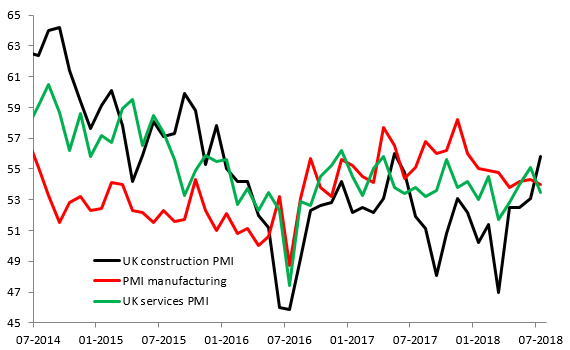 PMI dla usług wypada na poziomie 53,5 punktów przy oczekiwaniu spadku do 54,7 punktów z poziomu 55,1 punktów. Biorąc pod uwagę nieznaczny spadek indeksu dla przemysłu oraz wzrost PMI konstrukcyjnego, raczej nikt nie zakładał spadku indeksu kompozytowego do 53,6 punktów z poziomu 55,2 punktów. Z drugiej strony sektor usługowy ma największą wagę w indeksie kompozytowym, gdyż udział w budowie PKB jest zdecydowanie największy. Szczegóły dzisiejszego raportu nie odzwierciedlają jastrzębiegos spojrzenia na gospodarkę, które zaprezentowane zostało wczoraj przez bank centralny po posiedzeniu. Po pierwsze, raport pokazuje spadek tempa kreacji nowych miejc pracy do najniższego od niemal 2 lat, co jest jednym z powodów tak dużego cofnięcia się całego indeksu. Z drugiej strony większość firm wskazuje na bardzo dobrą sytuację na rynku pracy. Co ciekawe, ale mniej dobre dla rynku pracy jest to, że firmy wykazują cheć wprowadzenia automatyzacji i zmniejszenia ilości pracowników. Presja kosztowa w sektorze ulega zmniejszeniu, głównie ze względu na ceny wejściowe, które osłabiły się w stosunku do czerwca. Prezentowane w raporcie czynniki wydają się być odmienne do tego, co było prezentowane przez bank centralny wczorajszego dnia. Warto zauwazyć, że odbicie sprzedaży detalicznej było związane z dobrą pogodą (odbicie popytu w przypadku sektora turystycznego) oraz z czynnikami jednorazowymi takimi jak Mistrzostwa Świata w piłce nożnej, królewski ślub czy finał Pucharu Anglii.