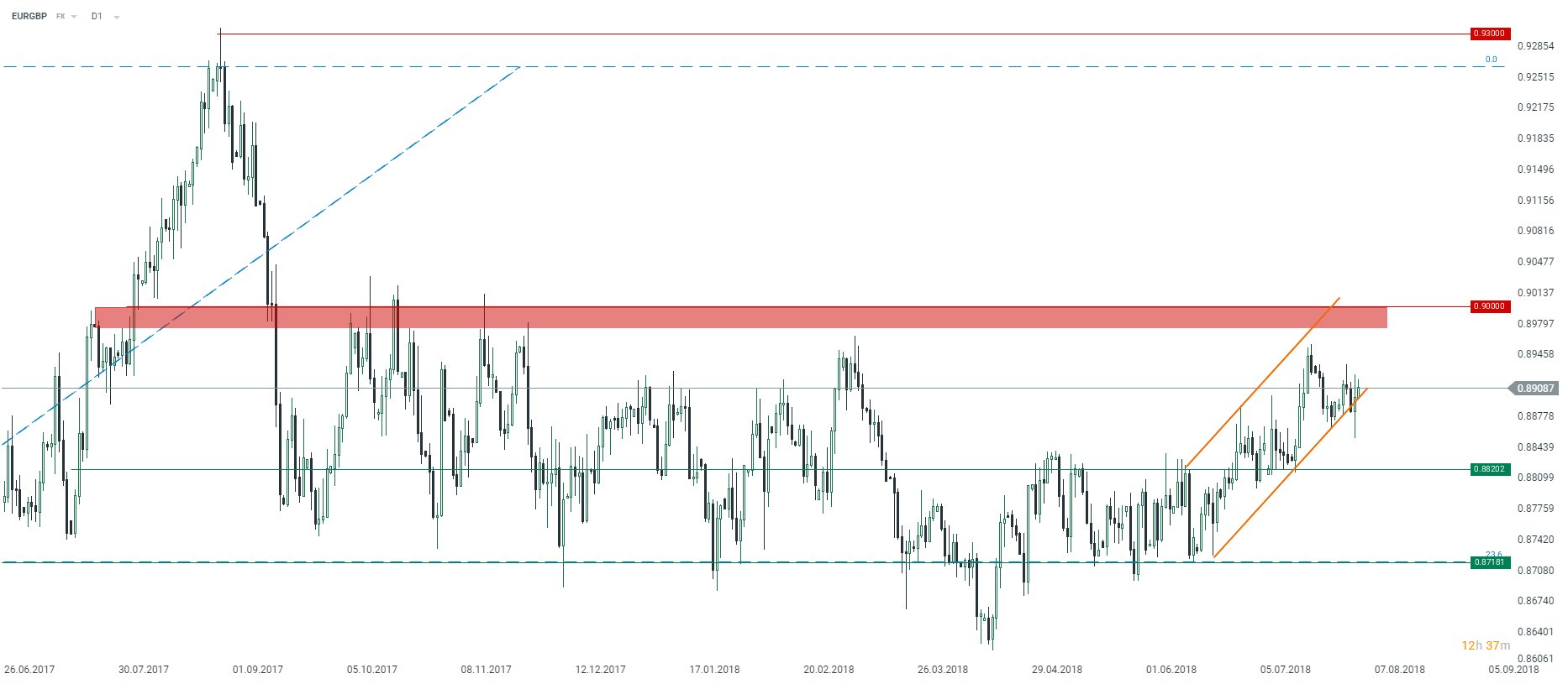 GBP kontynuuje wyprzedaż, również w stosunku do europejskiej waluty. Widać, że na parze EURGBP utworzyła się nowa fala wzrostowa prowadząca do górnego ograniczenia szerokiej i długoterminowej konsolidacji. Kluczowy opór zlokalizowany jest przy poziomie 0,90. Źródło: xStation5