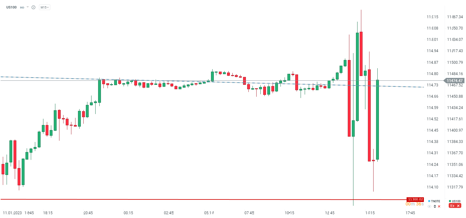 Rynek wciąż nie jest w stanie określić jaka powinna być reakcja na dzisiejszy odczyt inflacji. Z jednej strony spada, z drugiej strony nie tak mocno jak wszyscy by sobie życzyli. Fed w postaci Harkera zakomunikował, że kolejne podwyżki powinny wynosić 25 punktów bazowych, co powinno wspierać ożywienie na indeksach. Z drugiej strony kluczowa jest ilość podwyżek. Jeśli miałyby to być jedynie 2, byłoby to pozytywne dla rynku. Wszystko powyżej, a w szczególności szczyt stóp na poziomie 5,5 lub nawet wyżej byłby negatywny. Rynek obecnie wycenia niecałe 50 pb w trakcie dwóch kolejnych posiedzeń w lutym oraz w marcu.