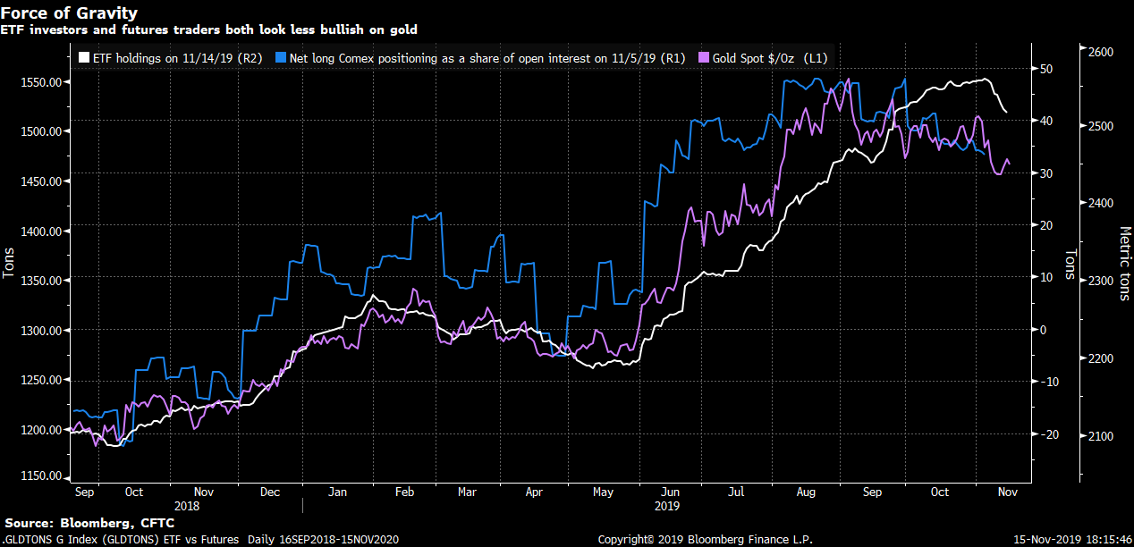 Cofanie się ETF oraz pozycjonowania netto względem otwartych pozycji. Źródło: Bloomberg