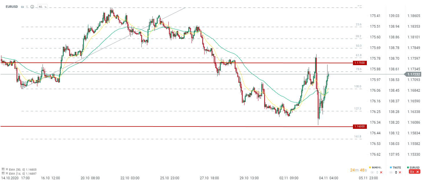 EURUSD kontynuuje odbicie. Jest to powiązane z rosnącym prawdopodobieństwem możliwej wygranej Bidena. Źródło: xStation5