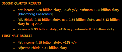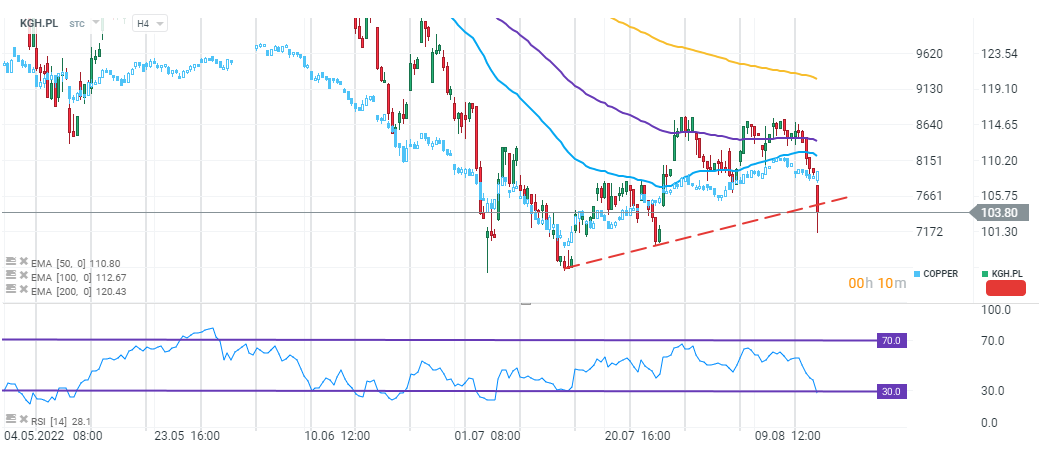 Słabe prognozy wzrostu gospodarczego Chin wywołały dzisiaj rano spadki cen miedzi na giełdach towarowych, co negatywnie przełożyło się na kurs akcji spółki KGHM (KGH.PL), które tracą obecnie blisko 4,5%. Niemniej ważnym czynnikiem, o ile nie dominującym dzisiejsze nastroje są słabe wyniki finansowe za drugi kwartał 2022 roku. Spółka wygenerowała zysk EBITDA na poziomie 2,18 mld zł wobec oczekiwań Reutersa na poziomie 2,53 mld zł. Analitycy JP Morgan zaznaczyli, że dane za kwartał są rozczarowujące (EBITDA niżej o 14% względem oczekiwań banku). Na wynikach zaważyły przede wszystkim słabe rezultaty międzynarodowych aktywów spółki.