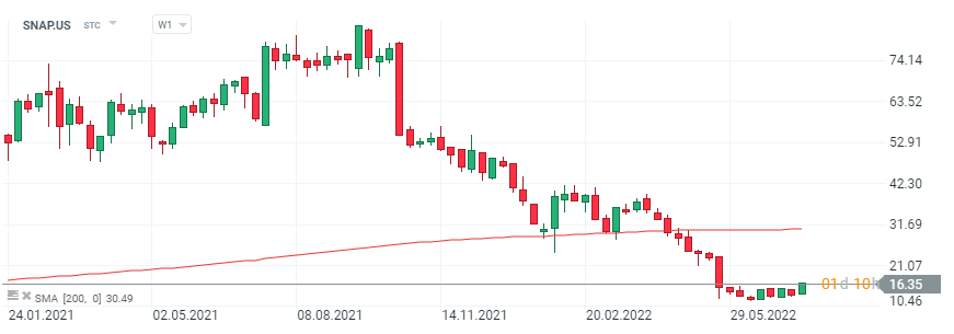 Wykres Snap Inc. (SNAP.US), interwał W1. Akcje weszły w spadkowy trend spadając poniżej 200 sesyjnej średniej kroczącej SMA200 w marcu 2022 roku. W olibczu kolejnych panicznych wyprzedaży popyt osłabł na tyle, że nawet nie spróbował ponownie zaatkaować kluczowego długoterminowego oporu w okolicach 30 USD za walor. Dzisiejsze spadkowe otwarcie jeszcze bardziej oddali perspektywę wyjścia na powierzchnię przez byki. Źródło: xStation5