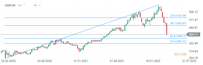 Akcje Costco COST.US, interwał W1. Akcje znajdowały się w dynamicznym trendzie wzrostowym od czasu wyprzedaży w marcu 2020 roku. Widzimy, że sprzedający zepchnęli cenę poniżej 480 USD, gdzie znajdowało się 38.2 zniesienie fali spadkowej wg. Fibonacciego i cena zmierza ku granicy 400 USD, która pokrywa się z lokalnymi szczytami z jesieni 2020 roku oraz wsparcia 61.8 zniesienia Fibo. Osunięcie się wyceny w okolice 400 USD będzie oznaczało jeden z największych spadków w historii firmy i tam inwestorzy mogą spodziewać się silniejszej reakcji popytu. Źródło: xStation5