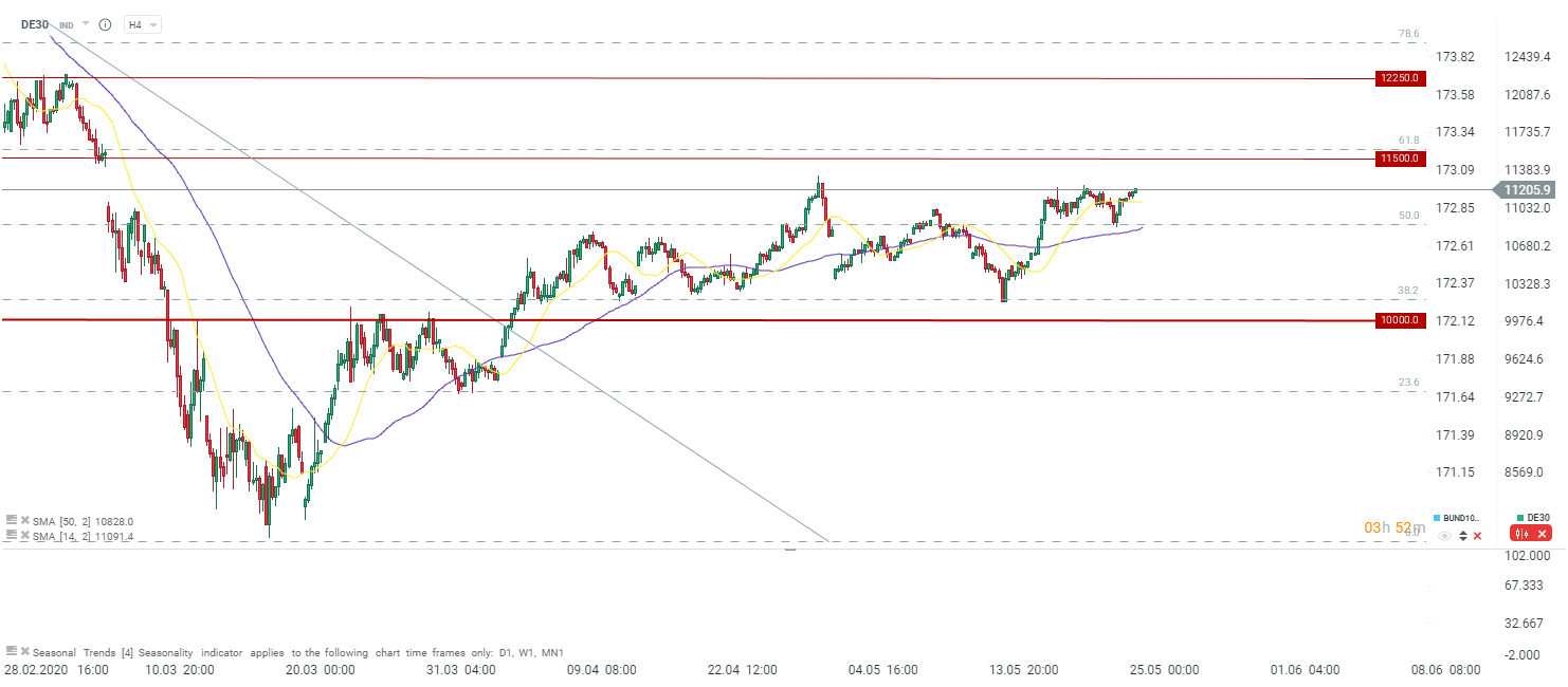 DAX próbuje wybić się z górnego ograniczenia konsolidacji. Kolejny silny opór to okolic 11500 punktów. Źródło: xStation5