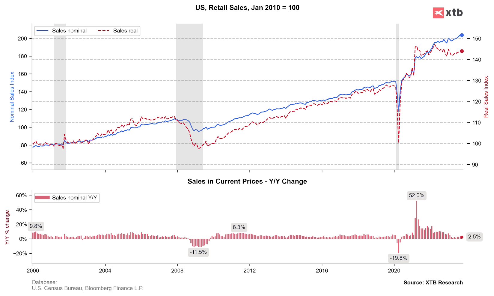 Chociaż sprzedaż w ujęciu rocznym spowolniła, to jednak trzeba mieć na uwadze wciąż wysoką bazę z 2022 roku. Źródło: Bloomberg Finance LP, XTB