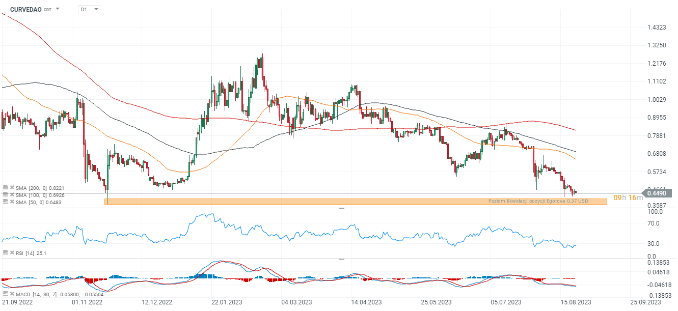 Kryptowaluta CurveDao jest jedną z istotniejszych systemowo dla zdecentralizowanych finansów (De-Fi). Założyciel całego ekosystemu Curve, Michael Egorov wg. raportu na początku sierpnia posiadał 100 mln USD w kryptowalutowych protokołach pożyczkowych. Kilka tygodni temu crypto-milioner Justin Sun, twórca blockchainu Tron i społeczność Curve wsparła Egorova chroniąc jego przed margin callem, który mógłby rozlać się na całą masę kryptowalut i protokołów pożyczkowych tworząć środowisko napędzające przeceny prawdopodobnie wszystkich kryptowalut. Od tego czasu jednak cena CURVEDAO wciąż spada i obecnie dzieli ją zaledwie 20% od 0,37 USD gdzie pozycja Egorova mogłaby zostać zlikwidowana.