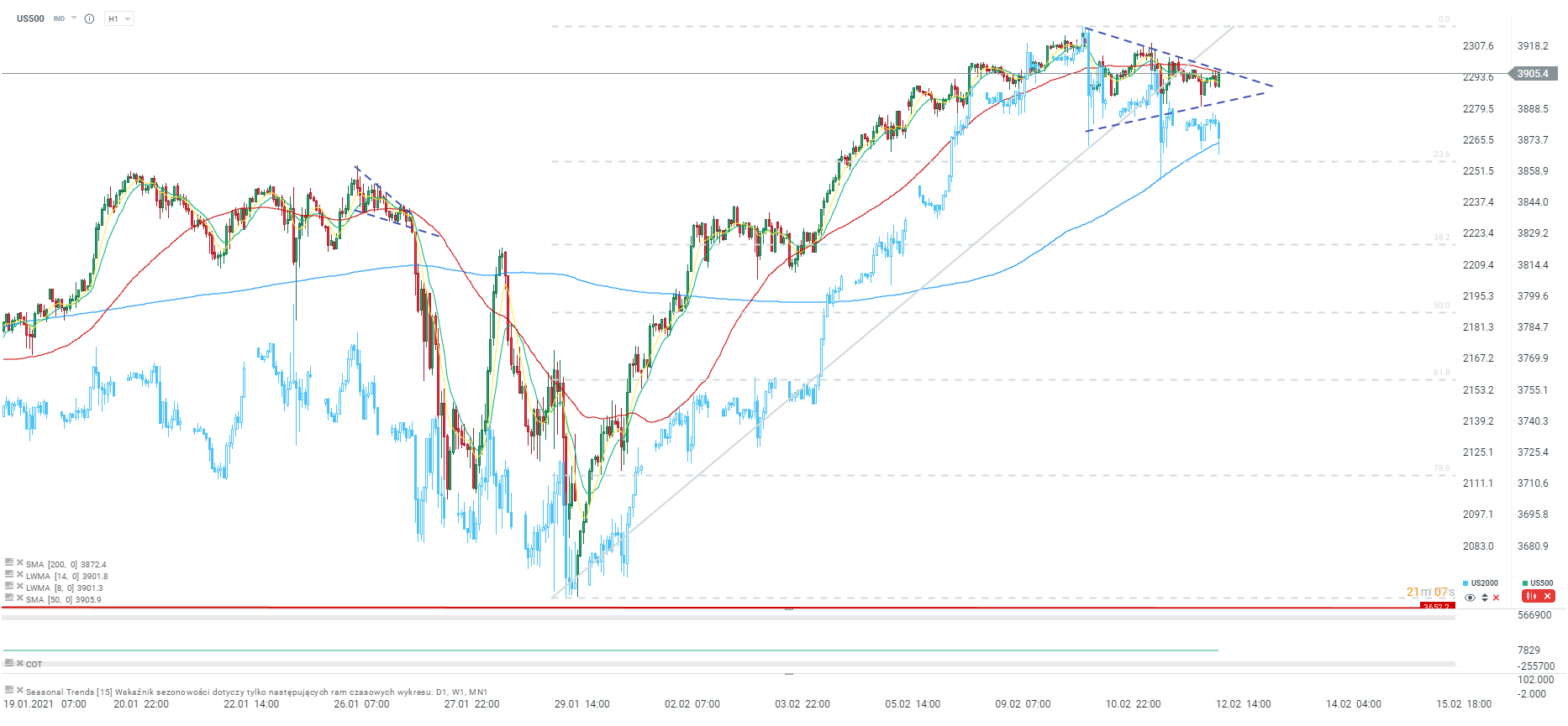 S&P 500 (US500), Nasdaq (US100) oraz przede wszystkim Russell 2000 (US2000) rozpoczynają ostatnią sesję spadkową spadkami. Z drugiej strony Dow Jones (US30) za sprawą Disneya notuje niewielkie wzrosty na początku sesji. Spadki na amerykańskich indeksach to pochodna gorszych nastrojów z Azji. Przypomnijmy, że chińskie rynki są zamknięte przez tydzień ze względu na obchody Nowego Roku Księżycowego. Brak nowych wieści dotyczących wprowadzenia pakietu fiskalnego w USA może być obecnie odbierany negatywnie przez inwestorów. Widać również umocnienie amerykańskiej waluty, co wpływa gorzej na globalne nastroje. O godzinie 16:00 opublikowany zostanie indeks zaufania konsumentów Uniwersytetu Michigan. Oczekiwany jest wzrost do poziomu 79,0 do 80,8 za luty, co może być powiązane z oczekiwaniem na wprowadzenie rządowego programu wsparcia.