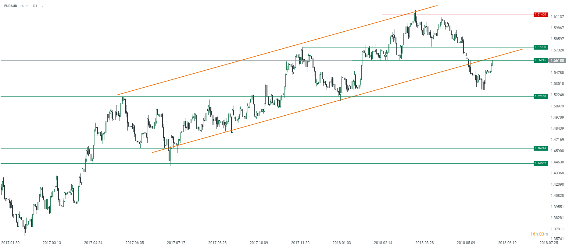 EURAUD może być bardzo ciekawą parą do obserwacji dzisiejszego dnia ze względu na posiedzenie EBC. Para znajduje się w pobliżu dolnego ograniczenia wzrostowego kanału trendowego. W przypadku rozczarowania dzisiejszym EBC, w pobliżu linii trendu możliwa będzie kumulacja większej siły sprzedającej. Źródło: xStation5