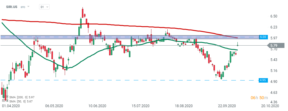 Sirius XM (SIRI.US) - kurs otworzył się dzisiaj dużą luką wzrostową i znalazł się powyżej 50-dniowej średniej kroczącej (zielona linia). Jeśli obecny sentyment się utrzyma, zagrożony może stać się nawet poziom oporu przy 6 USD. Źródło: xStation5