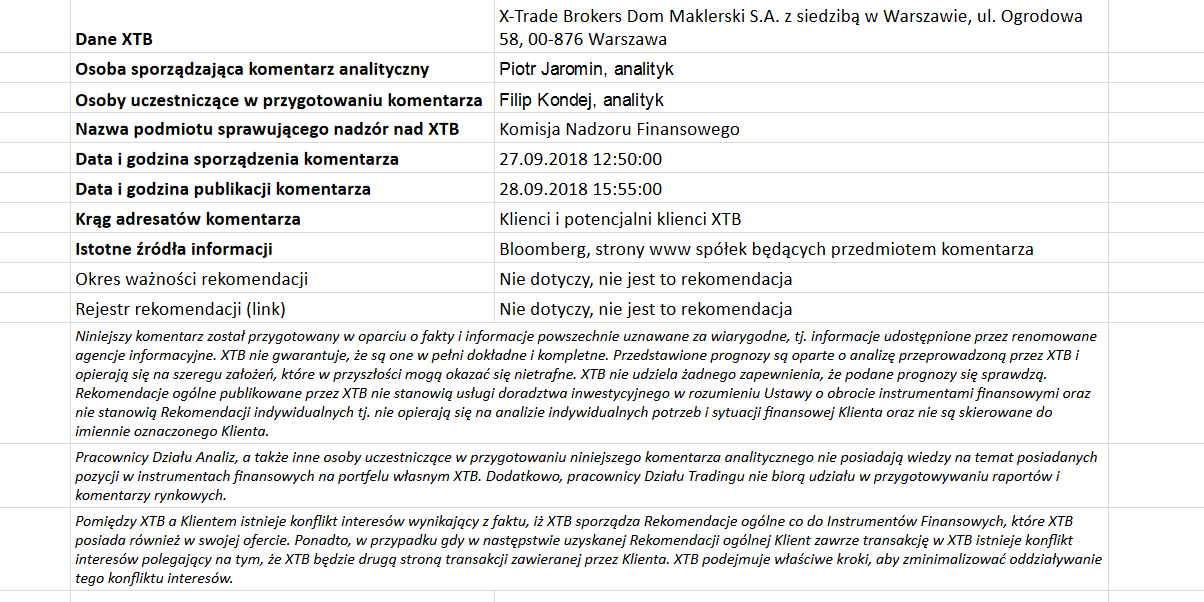 Ta publikacja handlowa jest informacyjna i edukacyjna. Nie jest rekomendacją inwestycyjną ani informacją rekomendującą lub sugerującą strategię inwestycyjną. W materiale nie sugerujemy żadnej strategii inwestycyjnej ani nie świadczymy usługi doradztwa inwestycyjnego. Materiał nie uwzględnia indywidualnej sytuacji finansowej, potrzeb i celów inwestycyjnych klienta. Nie jest też ofertą sprzedaży ani subskrypcji. Nie jest zaproszeniem do nabycia, reklamą ani promocją jakichkolwiek instrumentów finansowych. Publikację handlową przygotowaliśmy starannie i obiektywnie. Przedstawiamy stan faktyczny znany autorom w chwili tworzenia dokumentu. Nie umieszczamy w nim żadnych elementów oceniających. Informacje i badania oparte na historycznych danych lub wynikach oraz prognozy nie stanowią pewnego wskaźnika na przyszłość. Nie odpowiadamy za Twoje działania lub zaniechania, zwłaszcza za to, że zdecydujesz się nabyć lub zbyć instrumenty finansowe na podstawie informacji z tej publikacji handlowej. Nie odpowiadamy też za szkody, które mogą wynikać z bezpośredniego czy też pośredniego wykorzystania tych informacji. Inwestowanie jest ryzykowne. Inwestuj odpowiedzialnie.