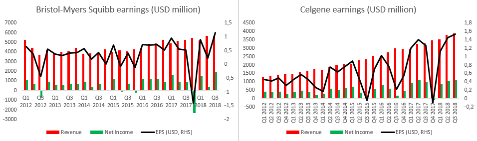 Celgene, w przeciwieństwie do Bristola, mógł cieszyć się stabilnym wzrostem przychodów w ostatnich 6 latach. Jednakże, zysk na akcję Bristol-Myers Squibb był mniej zmienny, ponieważ dał radę pozostać w zakresie od 0 do 1 dolara przez sporą część wspomnianego okresu. Źródło: Bloomberg.