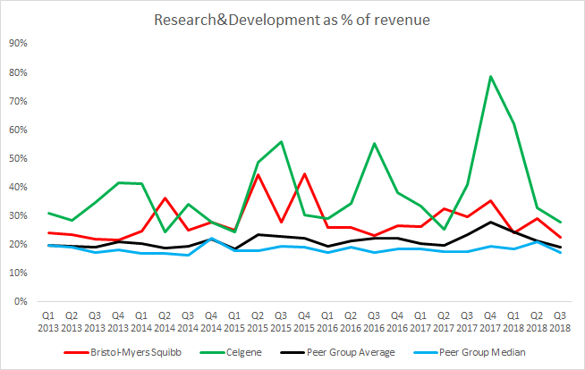 Zarówno Bristol Myers-Squibb, jak i Celgene, stale osiągały lepsze wyniki od analizowanej grupy firm, jeśli chodzi o wydatki na badania i rozwój. Grupa analizowanych firm (ang. Peer Group) składa się z Bristol-Myers Squibb, Celgene, Novartis, Pfizer, Merck, Gilead Sciences, AstraZeneca, AbbVie i Amgen. Źródło: Bloomberg, Bristol-Myers Squibb, Celgene.
