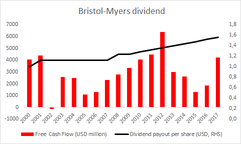 Po kilku latach stałej wypłaty dywidendy Bristol-Myers Squibb rozpoczął przeznaczać więcej pieniędzy dla swoich akcjonariuszy. Zauważmy, że firma pozostała wierna swojej polityce dywidendowej pomimo znaczących zmian wolnego przepływu pieniężnego. Z drugiej strony, Celgene nie dokonał nigdy żadnej wypłaty dywidendy w swojej historii. Źródło: Bloomberg, Bristol-Myers Squibb.