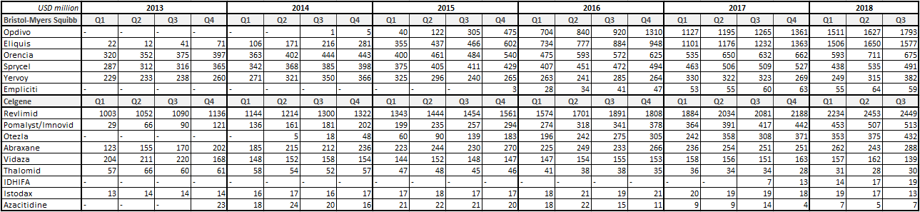 Przychody Bristola i Celgene’a według leków. Można zauważyć, że Bristol czerpie ogromną część przychodów ze sprzedaży leków Opdivo i Eliquis, natomiast lek Revlimid odpowiada za ponad 60% sprzedaży Celgene’a. Źródło: Bristol-Myers Squibb, Celgene.