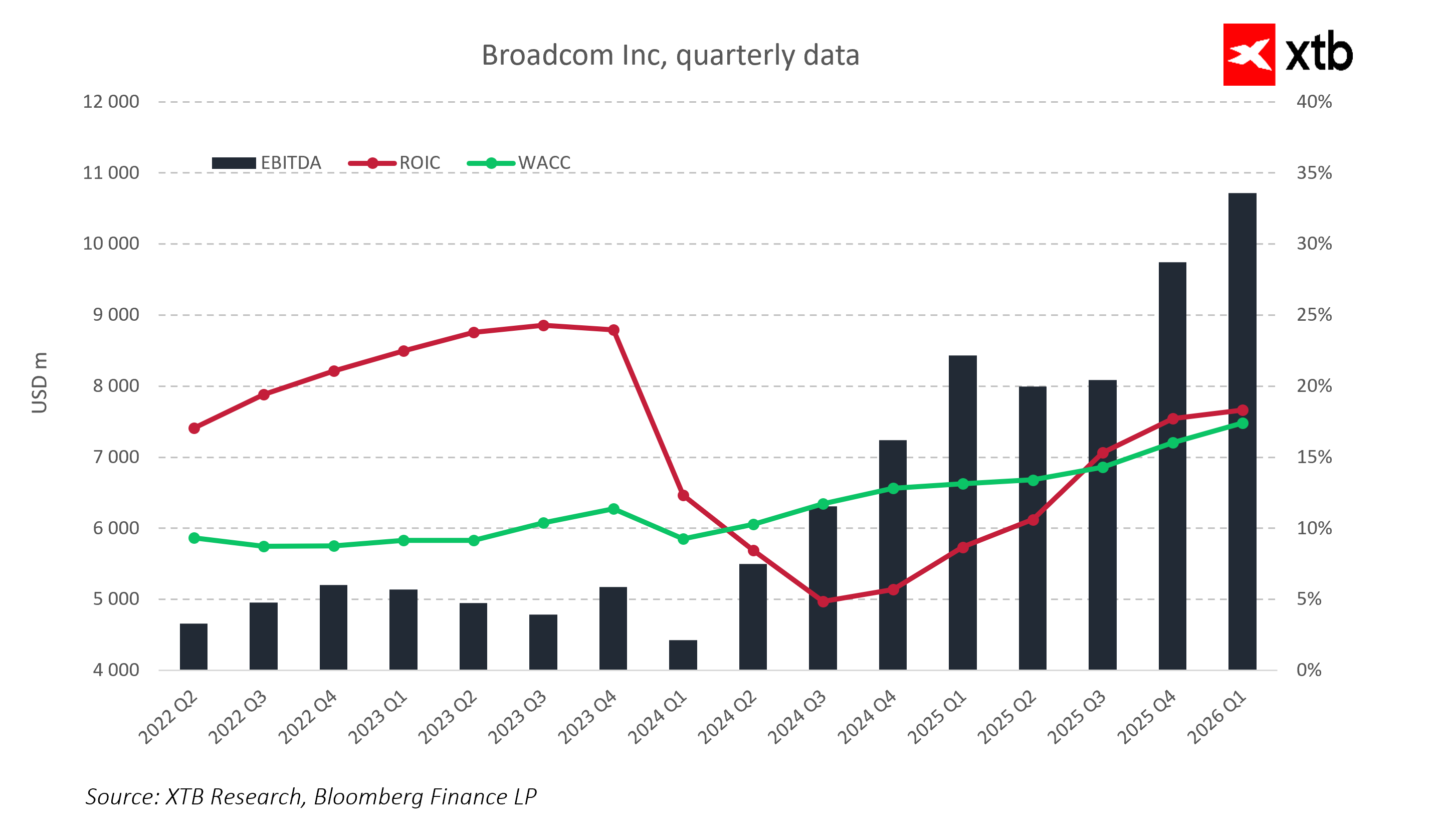 W pierwszym kwartale roku fiskalnego 2026 Broadcom ponownie pokazał, że potrafi skutecznie łączyć wzrost przychodów z wysoką efektywnością operacyjną. Firma odnotowała solidny wynik finansowy, napędzany przede wszystkim rosnącym popytem na niestandardowe akceleratory AI i układy sieciowe. Segment półprzewodników pozostaje głównym motorem przychodów, podczas gdy infrastruktura oprogramowania zapewnia stabilność i wspiera długoterminową strategię rozwoju. Skorygowany zysk operacyjny i EBITDA wskazują na zdolność Broadcom do generowania solidnej gotówki przy jednoczesnym inwestowaniu w przyszłość. Nakłady na badania i rozwój oraz inwestycje kapitałowe podkreślają konsekwentne zaangażowanie firmy w nowe technologie, przy zachowaniu dyscypliny finansowej.