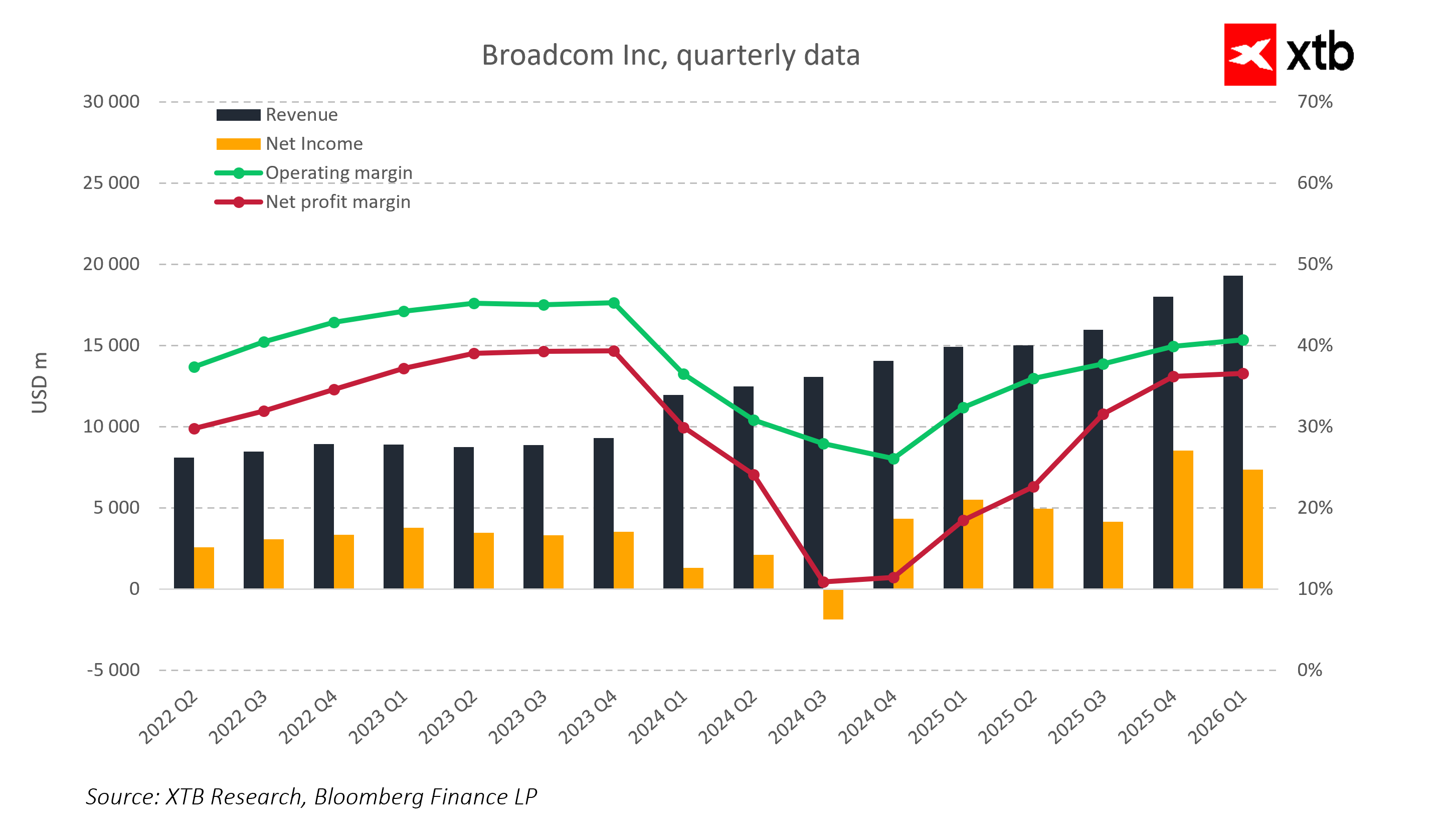 Wyniki finansowe Broadcom w ostatnich kwartałach wyraźnie pokazują rosnący trend przychodów oraz znaczną poprawę rentowności. Przychody systematycznie zwiększają się, osiągając rekordowe poziomy, co potwierdza skuteczność strategii firmy w szybko rozwijającym się segmencie półprzewodników i infrastruktury oprogramowania. Wysokie marże operacyjne i netto świadczą o sprawnym zarządzaniu kosztami oraz mocnej pozycji konkurencyjnej Broadcom.