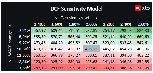 Na podstawie przeprowadzonej analizy DCF wartość jednej akcji Broadcom szacujemy na 435,72 USD, co w porównaniu z aktualnym kursem 317 USD daje potencjał wzrostu na poziomie 37%. Pokazuje to, że spółka nie tylko prezentuje solidne fundamenty finansowe, ale także oferuje atrakcyjną perspektywę dla inwestorów wierzących w dalszy rozwój rynku AI i infrastruktury sieciowej.