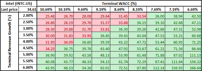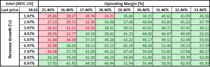 Trzecią metodą wyceny, którą się posłużymy, jest Gordon Growth Model, metoda oparta na dywidendach. Intel ma długą historię wypłacania i zwiększania dywidend, ale kluczową kwestią, na którą warto zwrócić uwagę, jest to, że na początku tego roku dokonano ogromnej obniżki dywidendy. Kwartalną wypłatę obniżono z 0,365 dolara na akcję do 0,125 dolara na akcję. To 65% obniżki! Skumulowana dywidenda za ostatnie 4 kwartały wynosi 0,98 dolara na akcję. Uwzględnienie tej wartości w modelu wzrostu Gordona, a także historyczny koszt kapitału własnego na poziomie około 9% i historyczny wzrost dywidendy na poziomie 6%, prowadzi nas do wyceny na poziomie 34,63 USD za akcję – prawie dokładnie zgodnie z obecną ceną rynkową.