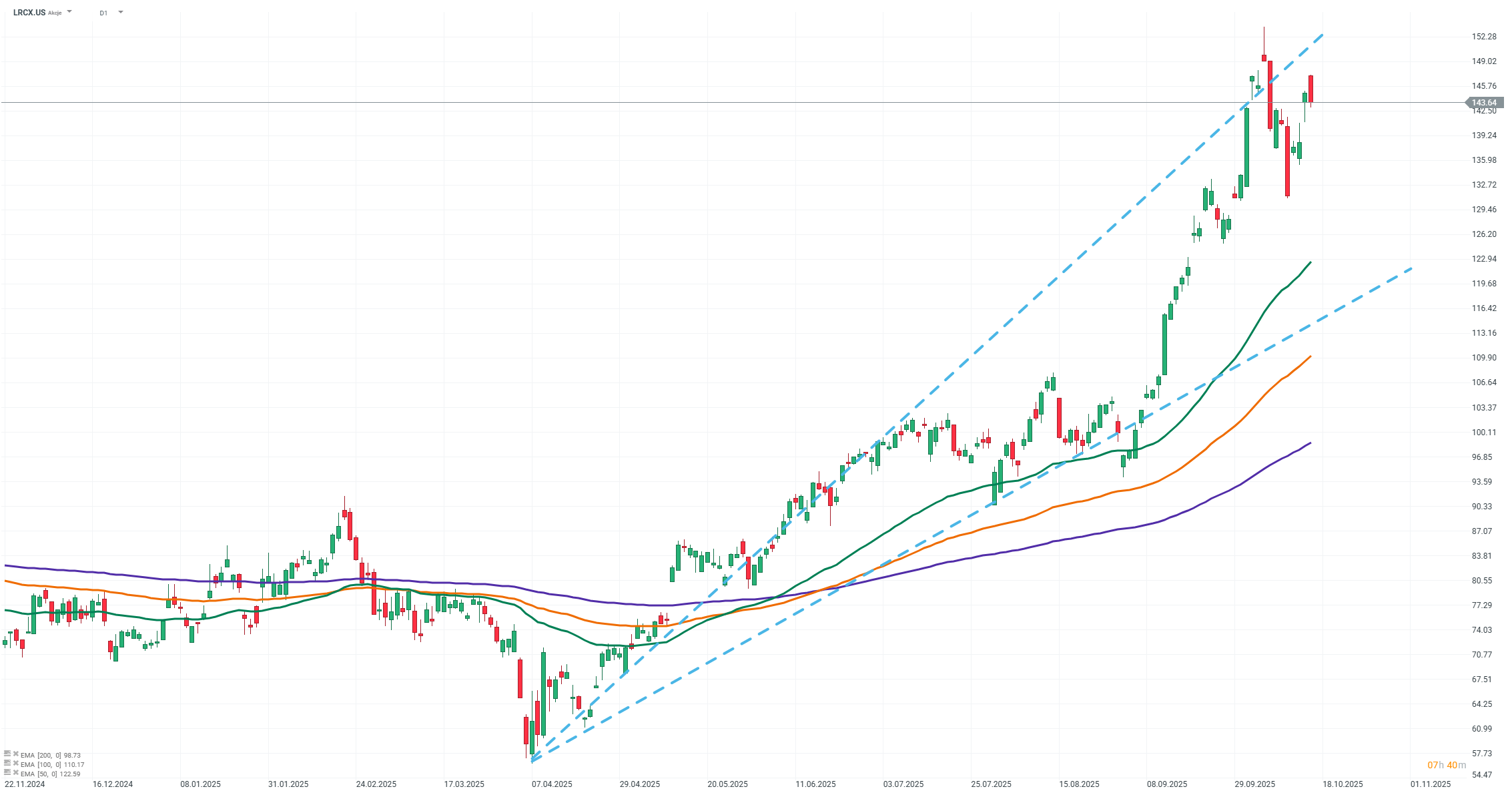 Analizując wykres notowań, widać wyraźnie, że akcje Lam Research znajdują się w silnym trendzie wzrostowym, wspieranym przez solidne fundamenty i rosnące zainteresowanie inwestorów sektorem AI.