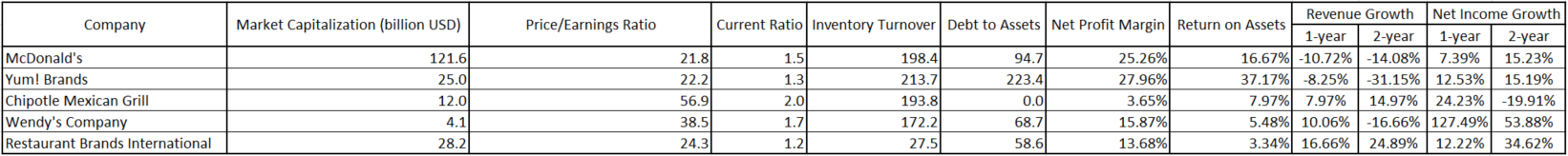Spoglądając na tabelę powyżej widać, że McDonald's jest znacznie większy niż jego główni konkurenci, dlatego prezentowana analiza porównawcza powinna być traktowana z pewną dozą ostrożności. Sprzedawca popularnych Bic Mac-ów ma najbardziej stabilną ze wszystkich spółek dynamikę zysku netto oraz jedną z najwyższych marży zysku netto wśród swoich konkurentów (co rekompensuje ujemną dynamikę przychodów). Oprócz tego McDonald's bardzo dobrze wygląda z punktu widzenia zarządzania zapasami. Pod względem wskaźnika ROA (Stopa zwrotu z aktywów) spółka również znajduje się na drugim miejscu spośród wymienionych w tabeli przedsiębiorstw. Przeciętnie wygląda jednak wskaźnik płynności bieżącej (current ratio). Obok marki Yum!(YUM.US) McDonald’s jest jedną z najbardziej zadłużonych firm w tabeli. Pod względem wskaźnika P/E (cena/zysk) sprzedawca Big Mac-ów wygląda również najlepiej, ze wskaźnikiem na poziomie 21,8.