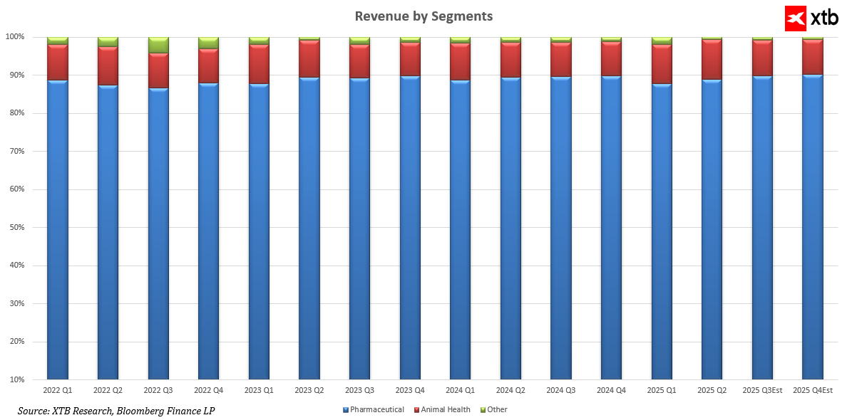 Segment Animal Health, choć mniejszy, pozostaje stabilnym i nieco rosnącym biznesem z przychodami na poziomie 1,2 do 1,6 miliarda dolarów kwartalnie, co dowodzi skutecznej dywersyfikacji źródeł przychodów. Segment „Other” jest najmniejszy i bardziej zmienny, ale pełni rolę działalności uzupełniającej, elastycznie dostosowywanej do potrzeb rynku.