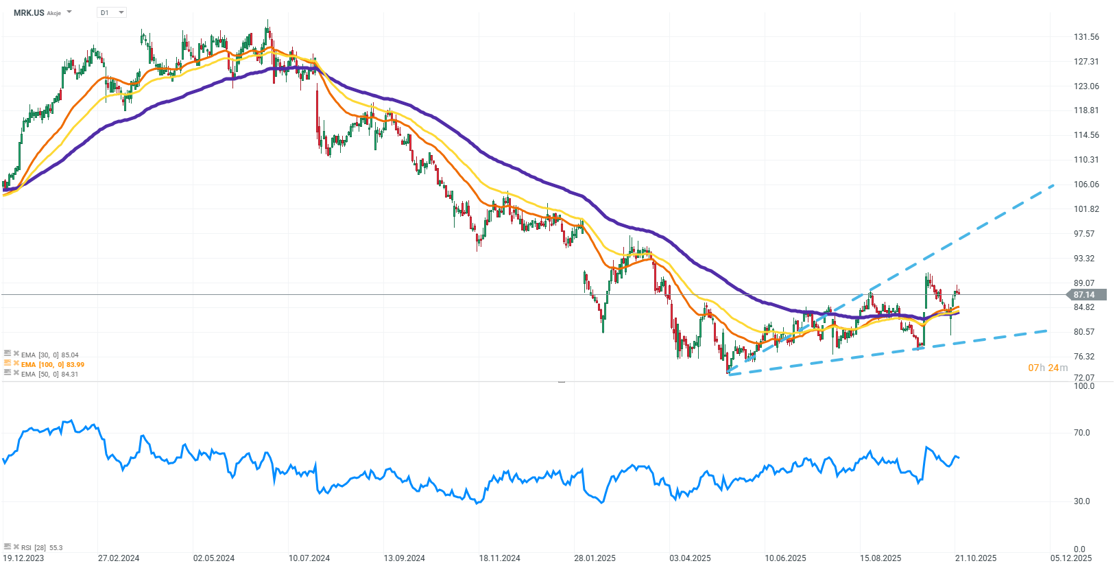 Obecnie kurs znajduje się w fazie konsolidacji w przedziale 85–95 USD. Z technicznego punktu widzenia kurs stopniowo wychodzi z długotrwałego trendu spadkowego, tworząc rosnący kanał. Średnie kroczące EMA(30), EMA(50) oraz EMA(100) zaczynają się zbliżać i kierować ku górze, co sugeruje możliwość zmiany trendu. Utrzymanie kursu powyżej 88–90 USD wspiera scenariusz wzrostowy, a wybicie powyżej 92–96 USD otworzyłoby drogę do dalszego ruchu w okolice 100 USD.