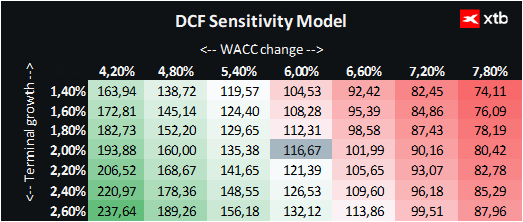 Analiza została opracowana w oparciu o scenariusz bazowy prognoz finansowych, zakładający stabilny wzrost przychodów w kolejnych latach oraz utrzymanie zdrowej rentowności operacyjnej. W modelu przyjęto koszt kapitału (WACC) na poziomie 6%, co uznajemy za wartość adekwatną dla branży farmaceutycznej. Sektor ten charakteryzuje się stabilnymi przepływami pieniężnymi, niską zmiennością wyników i defensywnym profilem ryzyka, co historycznie przekłada się na relatywnie niski koszt kapitału w porównaniu z innymi gałęziami gospodarki.