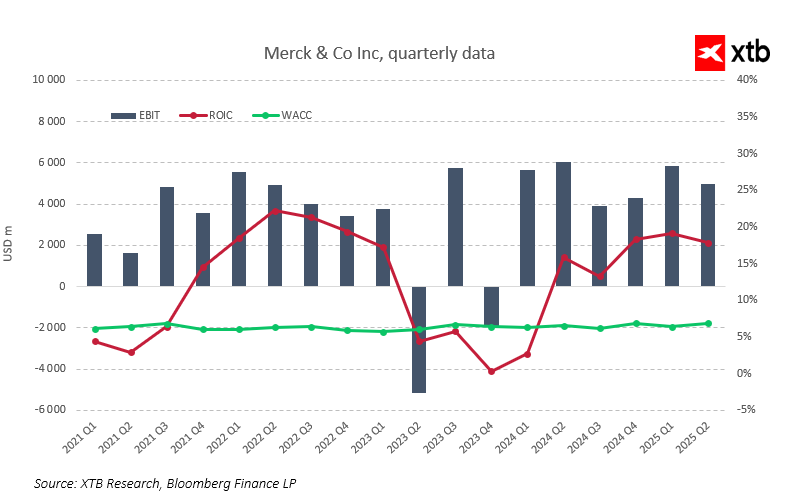 Warto zaznaczyć, że potencjalne obniżki stóp procentowych przez Rezerwę Federalną mogą w kolejnych kwartałach dodatkowo obniżyć koszt kapitału, co zwiększyłoby wartość bieżącą przyszłych przepływów pieniężnych. W przypadku Merck efekt ten mógłby być umiarkowanie pozytywny, ponieważ spółka utrzymuje niski poziom zadłużenia i finansuje się głównie kapitałem własnym, co zwiększa jej odporność na zmiany w otoczeniu makroekonomicznym.
