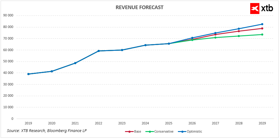 Scenariusz bazowy zakłada kontynuację stabilnego wzrostu przychodów, napędzanego utrzymaniem silnej pozycji w kluczowych segmentach, zwłaszcza onkologii. Spodziewamy się umiarkowanego wzrostu sprzedaży leków przy jednoczesnym utrzymaniu stabilnej bazy przychodów z segmentów farmaceutycznego i Animal Health. Przychody w tym wariancie wzrosną z około 65 miliardów dolarów w 2025 roku do blisko 79 miliardów dolarów w 2029 roku. Scenariusz ten odzwierciedla równowagę pomiędzy korzystnymi trendami rynkowymi a naturalną dojrzałością branży oraz presją konkurencyjną.
