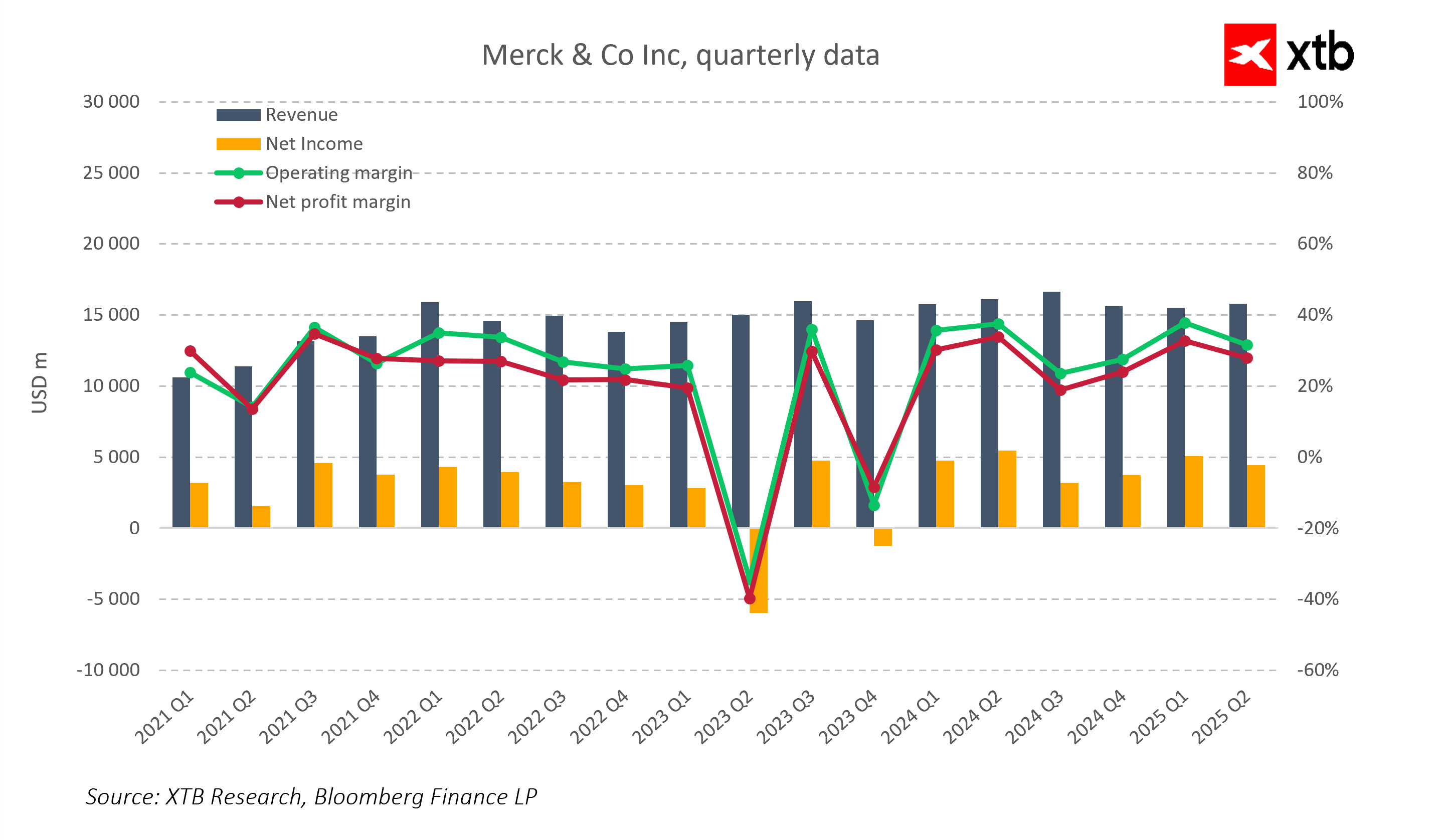 Pomimo chwilowych trudności, Merck prezentuje solidne fundamenty finansowe. Mimo okresowych spadków marż w pojedynczych kwartałach, ogólnie marżowość pozostaje na wysokim poziomie, z marżami operacyjnymi i netto utrzymującymi się w przedziale 25–35 procent. To potwierdza skuteczność działań naprawczych i odporność modelu biznesowego.