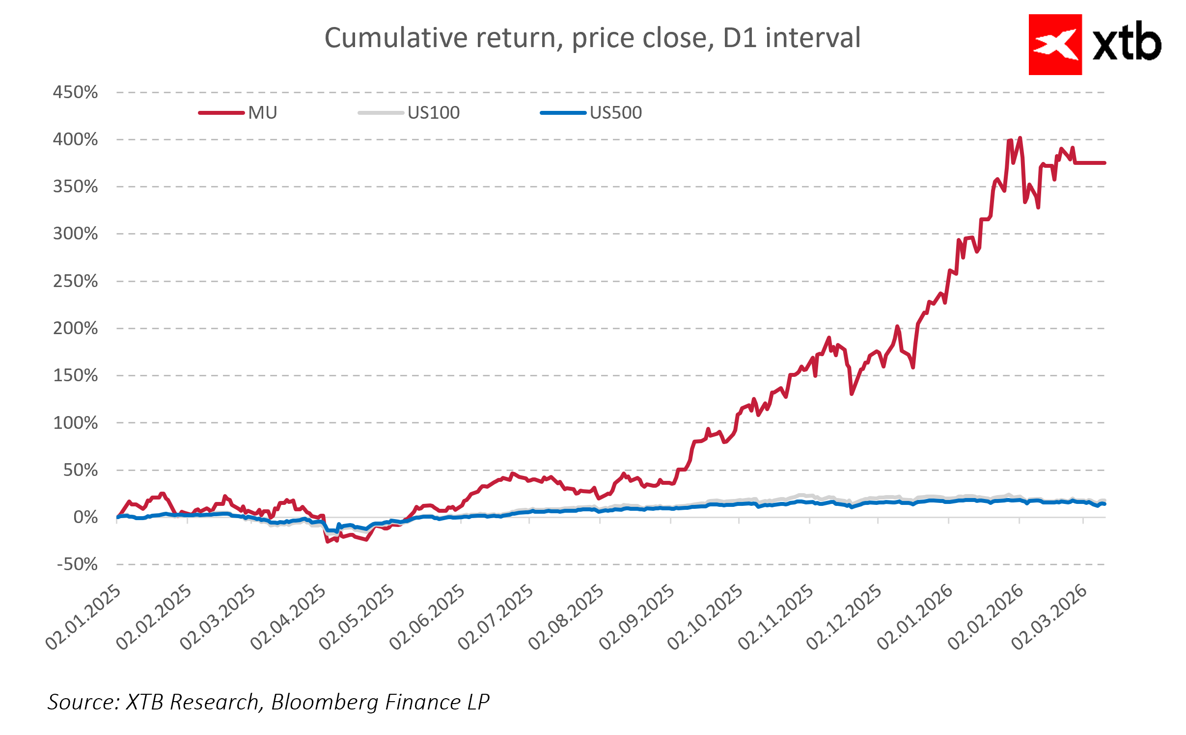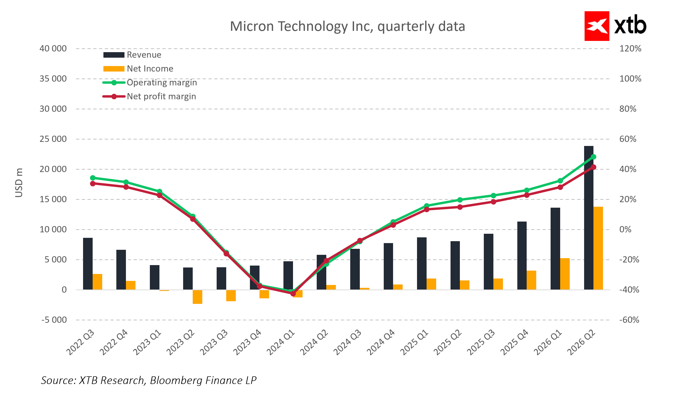 Tak spektakularne pobicie prognoz nie jest przypadkiem. Micron w pełni wykorzystuje wyprzedane zapasy HBM i serwerowego DRAM, gdzie popyt z hyperscalerów znacząco przewyższa podaż. Marże wróciły do poziomów historycznych szczytów cykli pamięciowych, a wysoka dźwignia operacyjna przełożyła wzrost sprzedaży na wykładniczy przyrost zysków.