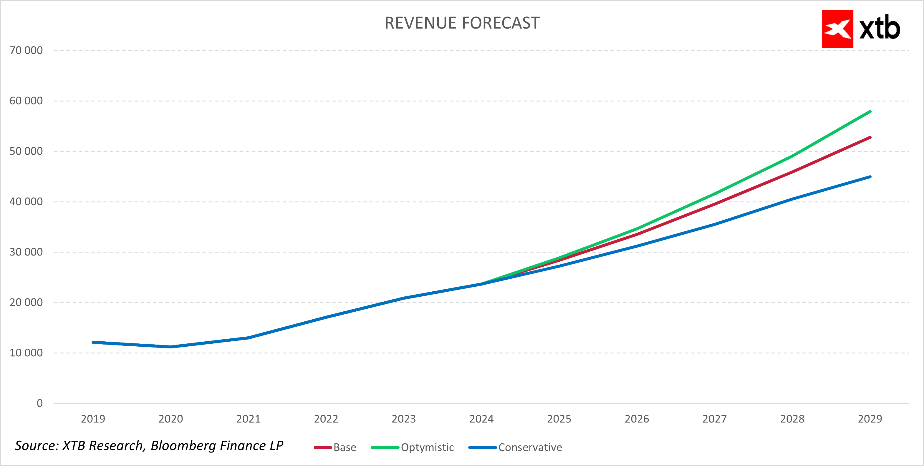 W wariancie konserwatywnym tempo wzrostu przychodów jest umiarkowane i wynosi około 45 miliardów dolarów w 2029 roku. W tym scenariuszu zakłada się większą niepewność związaną z cyklicznością rynku infrastrukturalnego, presją na koszty materiałów i prac oraz wolniejsze tempo inwestycji w kluczowych sektorach. Konkurencja i regulacje mogą dodatkowo ograniczać skalę ekspansji. Pomimo tych wyzwań, spółka nadal notuje stabilny wzrost, chociaż z bardziej zachowawczą dynamiką.