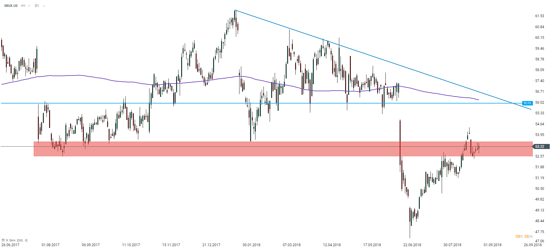Po znacznym spadku pod koniec lipca po ogłoszeniu przez Starbucksa informacji o tym, że firma planuje zamknąć ponad sto kawiarni w kolejnym roku, cena ponownie wraca z powrotem do strefy cenowej w zakresie $52,60-53,50. Notowania wciąż znajdują się wyraźnie poniżej długookresowej średniej kroczącej (200-okresowa prosta średnia ruchoma, fioletowa linia) oraz spadkowej linii trendu. Źródło: xStation5.