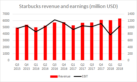 Firma utrzymuje stabilny wzrost przychodów w ostatnich latach. Ostatni raport tylko potwierdził tą sytuacje. Firma zwiększyła sprzedaż o 11,46% w ciągu ostatniego roku. Zysk operacyjny skurczył się o 0,57% r/r, co przy rosnących przychodach wskazuje na spadek marży operacyjnej. W związku z ostatnimi reformami podatkowymi na wykresie przedstawiliśmy zysk operacyjny zamiast zysku netto, ponieważ wspomniany wcześniej spadek mógłby pozostać niezauważony. Ostatni raport i komentarze ze strony władz spółki wróżą jednak dobrze przyszłości spółki. Starbucks pokazał, że udało mu się zwiększyć liczbę aktywnych użytkowników jego programów lojalnościowych o 14% r/r do 15,1 miliona użytkowników, a średnie wydatki na wizytę klienta wzrosły o 3% r/r. Niemniej jednak interesującym może być fakt, iż przychody firmy wykazują się sezonowością. Na wykresie powyżej możemy dostrzec, że pierwszy kwartał roku charakteryzował się niższą sprzedażą w poprzednich latach.