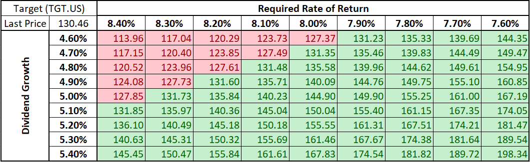 Jak to zwykle bywa w przypadku modeli wyceny, model wzrostu Gordona jest również bardzo wrażliwy na przyjęte założenia. Poniżej przedstawiono macierz wrażliwości dla założeń dotyczących wzrostu dywidendy i wymaganej stopy zwrotu. Zielone kafelki pokazują kombinacje, które skutkują wyceną powyżej rynku, a czerwone kafelki pokazują kombinacje, które skutkują wyceną poniżej rynku.