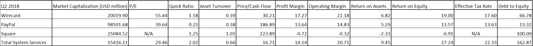 Porównując Wirecard z innymi firmami związanymi z płatnościami, otrzymujemy niejednoznaczny obraz. Z jednej strony niemiecka firma osiągnęła najwyższy zysk operacyjny i marże zysków, ukazując dobre perspektywy zysku, jak również względnie płynną pozycję (wskaźnik płynności szybkiej - ang. quick ratio). Z drugiej strony, Wirecard, wraz z PayPalem, jest jedną z najmniej wydajnych firm, jeśli chodzi o zarządzanie aktywami, co ukazują najniższe wskaźniki obrotu aktywami. Do porównania rentowności wśród badanych firm, lepiej jest spojrzeć na wskaźniki rentowności aktywów (ang. return on assets), ponieważ użycie długo wyraźnie różni się wśród przedsiębiorstw zaprezentowanych w tabeli powyżej. Patrząc na wspomniany wskaźnik rentowności aktywów, Wirecard wypada lepiej niż PayPal, będący największą firmą wśród przedstawionych w tabeli, jeśli chodzi o kapitalizację rynkową. Podczas, gdy wskaźnik cena-zysk (ang. P/E) Wirecarda jest najwyższy, jego przepływy pieniężne podlegają najbardziej konserwatywnej wycenie (ang. Price/Cash Flow). Jednakże, jeśli chodzi o efektywną stopę opodatkowania, Wirecard zostaje w tyle w porównaniu do analizowanych firm. Wynika to z prostego faktu, że Wirecard jest jedyną firmą w tabeli, która nie jest amerykańska, a firmy amerykańskie mogą korzystać na tym polu z obniżek podatków poczynionych w zeszłym roku w Stanach Zjednoczonych.