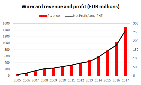 Wirecard została założona w 1999 roku w Monachium i skupiała się na zapewnieniu rozwiązań płatniczych dla obywateli Niemiec. We wczesnych latach działalności, jej usługi były wykorzystywane głównie przez hazardzistów i strony związane z pornografią, co sprawiło, że wizerunek firmy był nie do końca pozytywny. Jednak dużo zmieniło się od tego czasu, a Wirecard stała się jedną z większych i bardziej odnoszących sukcesy spółek w swojej branży. Firma trafiła na giełdę w październiku 2000 roku, a jej akcje poszybowały w dół po tym, gdy bańka dot-comów pękła. Wycena firmy spadła o 98% w ciągu następnych dwóch lat, zanim zaczęła powoli odbudowywać swoją wcześniejszą wycenę. W 2002 roku CEO Wirecarda został Markus Braun, który pozostaje na tej pozycji po dzień dzisiejszy. Pierwszy pełny rok jego szefostwa (tj. rok 2003) był pierwszym rokiem, gdy Wirecard odniósł zysk netto. Pod przywództwem Brauna firma rozpoczęła powoli dystansować się od nieciekawego wizerunku, który miała wcześniej oraz rozpoczęła światową ekspansję. Niemniej jednak, firmie zajęło prawie 12 lat odbudowanie swojej wcześniejszej wyceny z pierwszej sesji, na której była notowana. Cena akcji firma urosła z poziomu 17,4 euro w dniu IPO do ponad 160 euro obecnie. Wirecard współpracuje obecnie z dwustoma sieciami płatniczymi i ma aż 35 milionów prywatnych klientów na całym świecie, jednak najlepsze być może jeszcze przed nią.