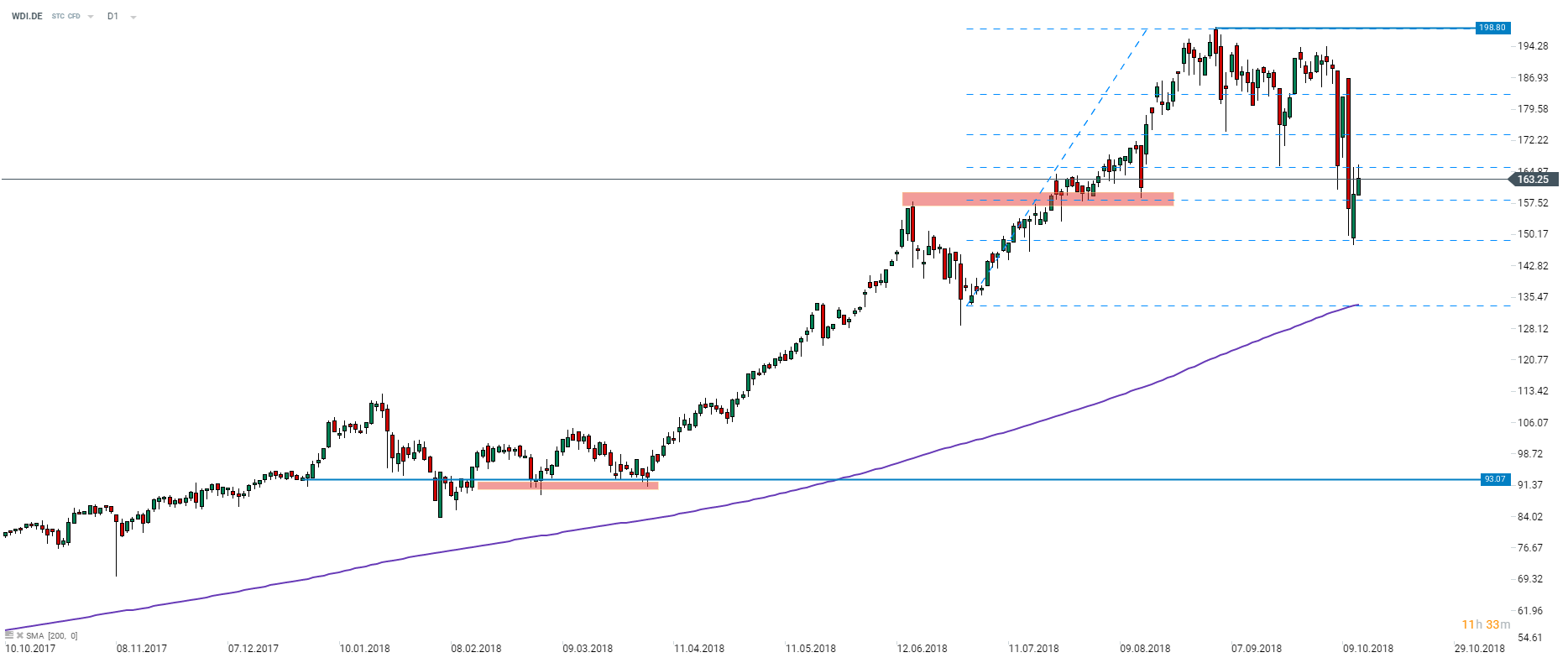 Po osiągnięciu historycznego szczytu na poziomie 198,80 dolara na początku września akcje Wirecarda zaczęły słabnąć. Cena akcji firmy była przedmiotem gwałtownych zmian w ciągu tego tygodnia, wliczając w to dwa dni głębokich spadków. Niemniej jednak firma związana z płatnościami wciąż znajduje się wyraźnie powyżej poziomu 93,07 dolara, na którym zakończyła poprzedni rok. Zauważmy, jak akcje zachowują się względem poziomów Fibo opartych na wzroście, który doprowadził do historycznego maksimum. Źródło: xStation5.