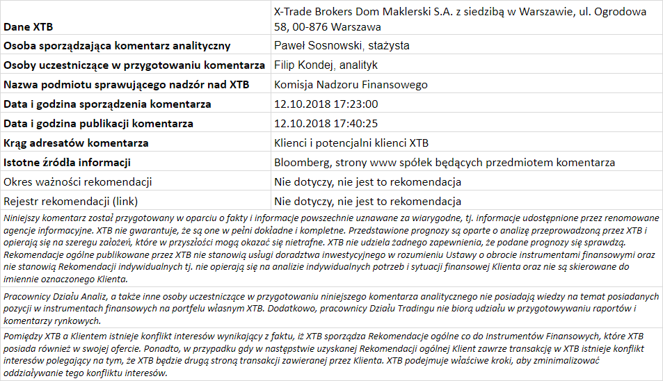 Ta publikacja handlowa jest informacyjna i edukacyjna. Nie jest rekomendacją inwestycyjną ani informacją rekomendującą lub sugerującą strategię inwestycyjną. W materiale nie sugerujemy żadnej strategii inwestycyjnej ani nie świadczymy usługi doradztwa inwestycyjnego. Materiał nie uwzględnia indywidualnej sytuacji finansowej, potrzeb i celów inwestycyjnych klienta. Nie jest też ofertą sprzedaży ani subskrypcji. Nie jest zaproszeniem do nabycia, reklamą ani promocją jakichkolwiek instrumentów finansowych. Publikację handlową przygotowaliśmy starannie i obiektywnie. Przedstawiamy stan faktyczny znany autorom w chwili tworzenia dokumentu. Nie umieszczamy w nim żadnych elementów oceniających. Informacje i badania oparte na historycznych danych lub wynikach oraz prognozy nie stanowią pewnego wskaźnika na przyszłość. Nie odpowiadamy za Twoje działania lub zaniechania, zwłaszcza za to, że zdecydujesz się nabyć lub zbyć instrumenty finansowe na podstawie informacji z tej publikacji handlowej. Nie odpowiadamy też za szkody, które mogą wynikać z bezpośredniego czy też pośredniego wykorzystania tych informacji. Inwestowanie jest ryzykowne. Inwestuj odpowiedzialnie.