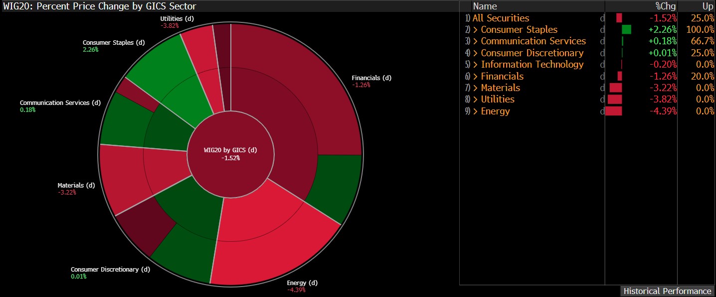 Notowane dzisiaj spadki na polskim parkiecie napędzane są przez wyprzedaże w sektorach powiązanych z energetyką, paliwami oraz wydobyciem. Źródło: Bloomberg