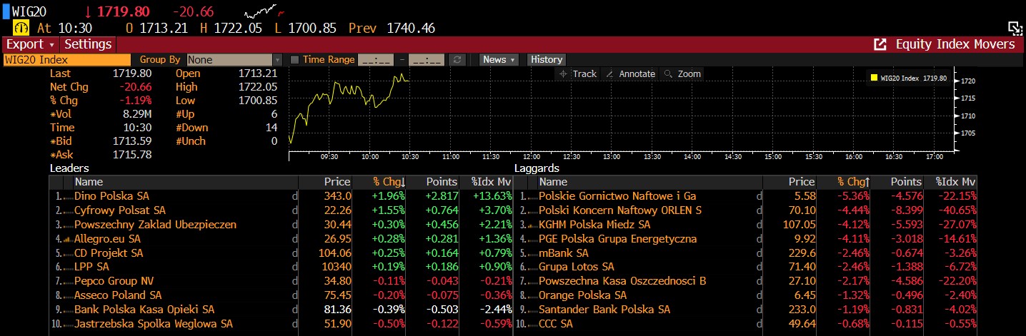 Spółki wchodzące w skład indeksu WIG20 (W20) i ich największe zmiany procentowe w ujęciu dziennym. Źródło: Bloomberg