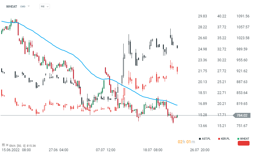 Zestawienie wycen pszenicy (WHEAT) oraz walorów Kernel Holding (KER.PL) i Astarta Holding (AST.PL). Źródło: xStation 5
